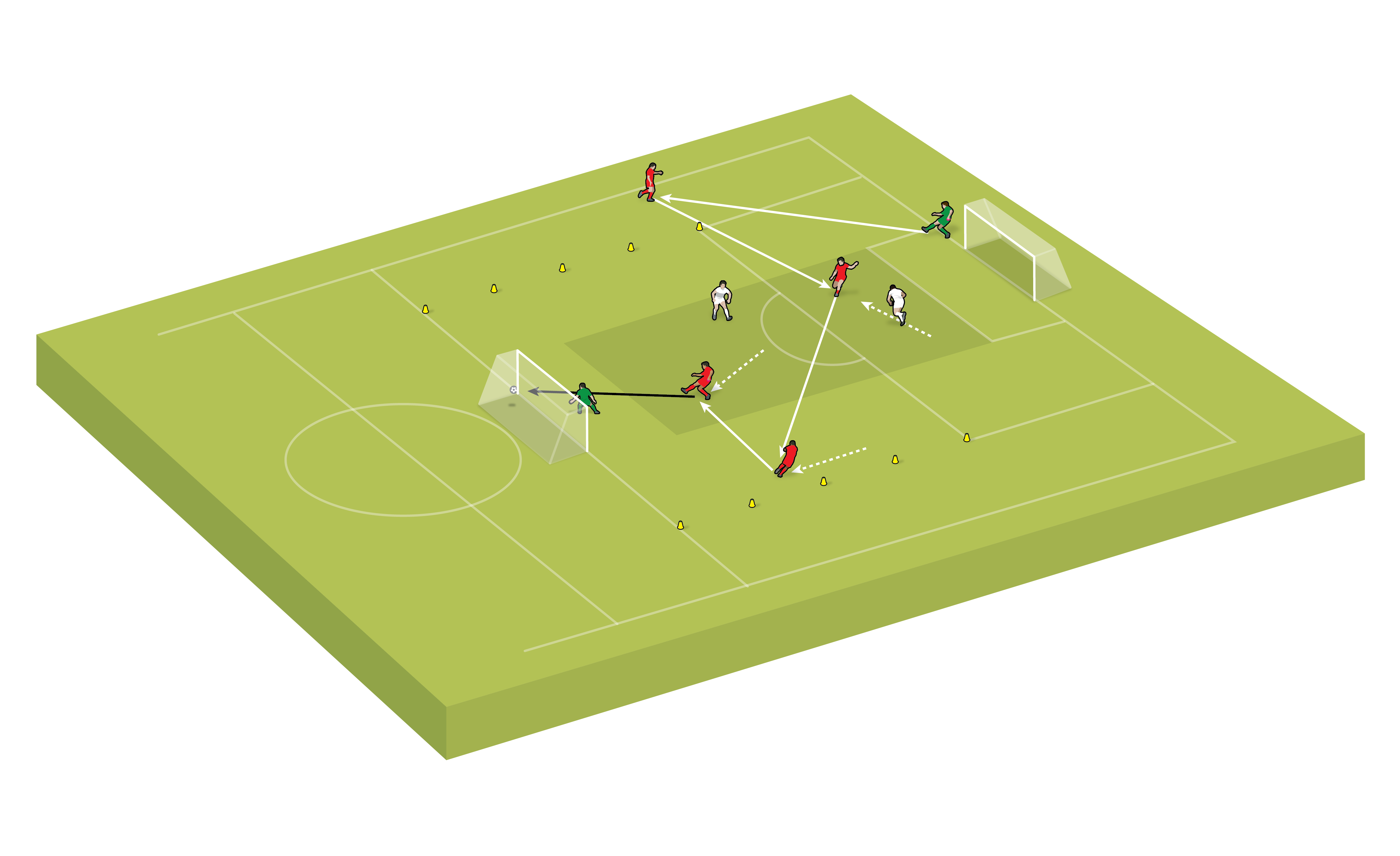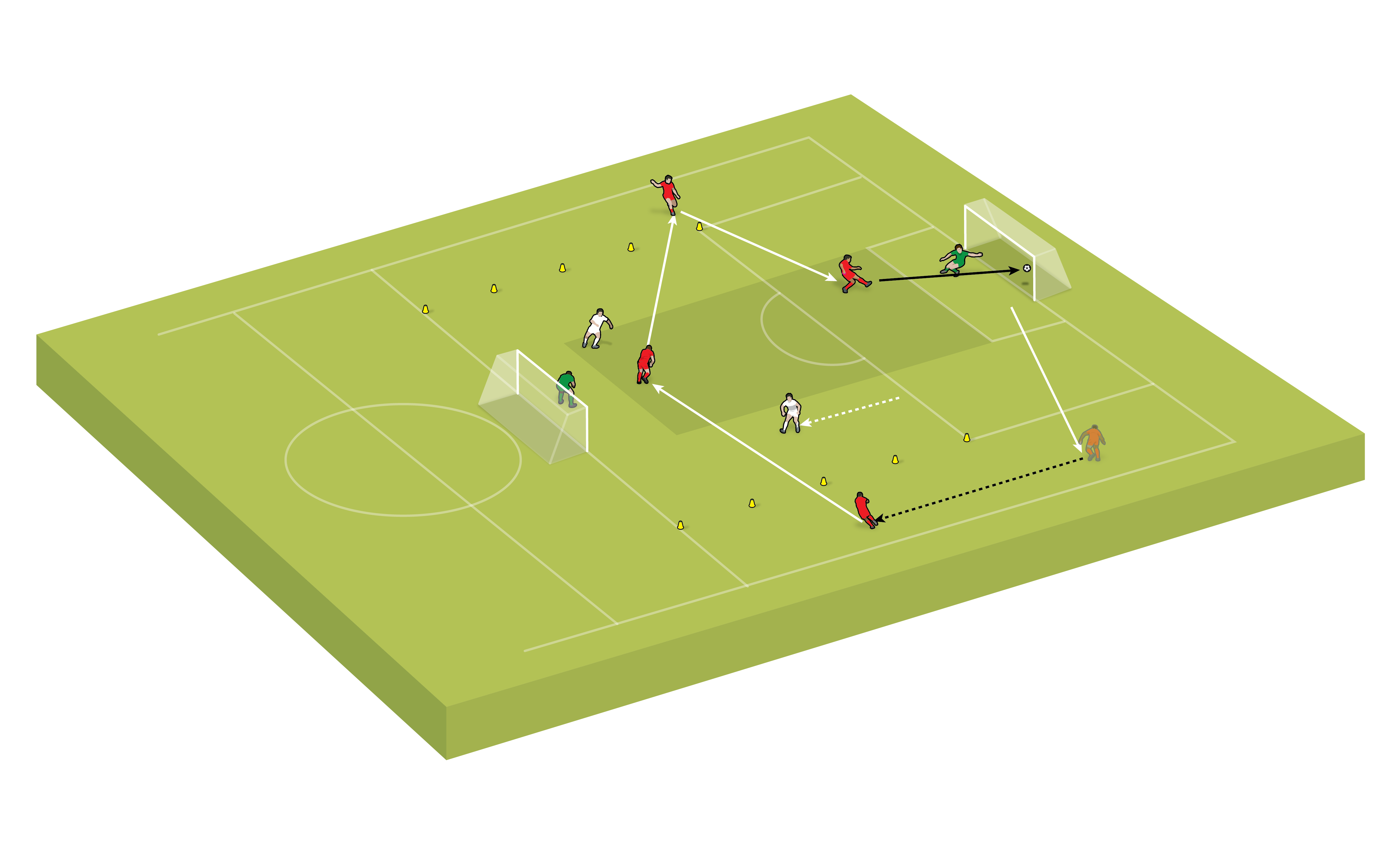 The game starts and restarts with a pass from one of the goalkeepers. The game is not directional, so attackers can score in either goal. In the final part of the game, allow players to go out of the box.