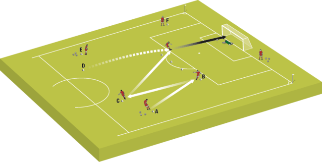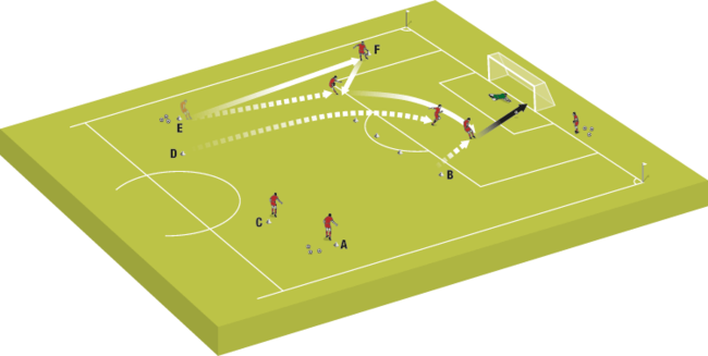 As the first move ends, the second begins from the other flank. E plays to F who sets it back for E to hit a first-time cross into the box. Players B and D vary their runs and try to finish the cross.