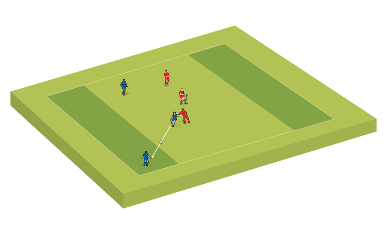 Normal rules apply. To win a point, a player must pass the ball to a team-mate who is stood in the end zone they are attacking. The opposition start then with the ball in their end zone. If the ball goes out of play at any time, the game restarts with a player dribbling or passing the ball into play. The player can use this restart to pass the ball straight into a team-mate in the end zone.