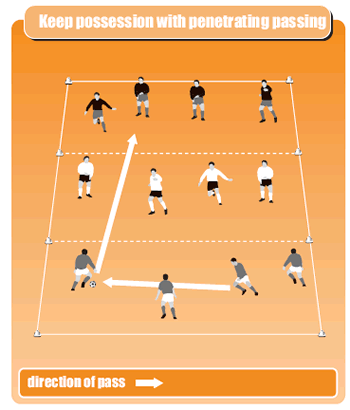 The two end teams (black and grey in the diagram) must maintain possession of the ball - award a 'goal' each time one of the teams successfully passes through the middle section.