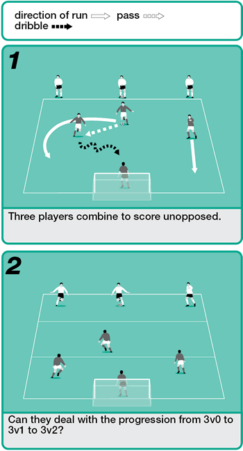 There is an overload progression in this drill which allows the attackers to learn to build-up play gradually so they get to know position and movement.