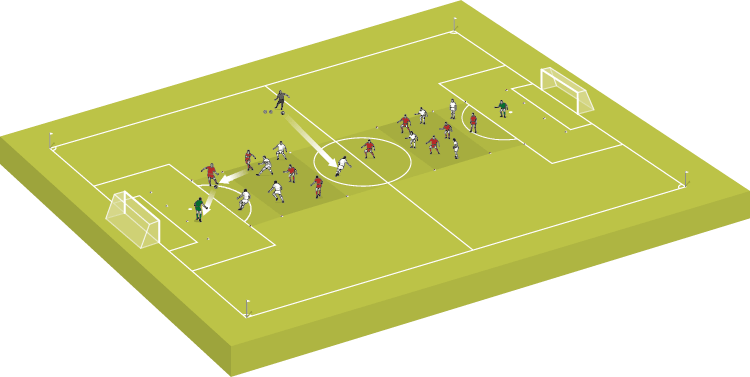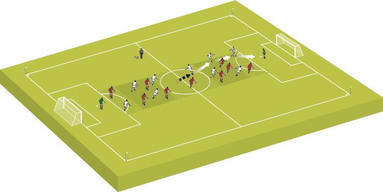 Play a 9v9, plus neutral keepers in the end zones. Split the players as shown – they must stay in their areas. Play starts with a pass from the coach to one of the players in the centre zone who can attack in any direction. If the ball is intercepted or goes out, the defending team gets the ball but must score by getting it to the keeper in the opposite half. If a point is scored, the coach restarts play with a pass in the centre zone.
