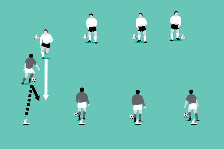 Both players run to their opposite cones and the drill is repeated, beginning with the player on the ball.