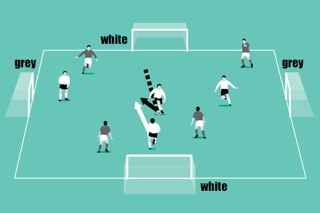 Play 4v4 on a pitch approx 30x20m with one goal on each side of the pitch. One team attacks the goals across the width of the pitch, the other attacks the goals down the length of the pitch.