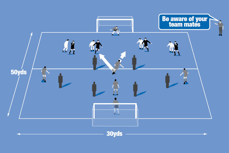 Now play a small-sided game on a pitch, split into two halves, with a goal at each end.