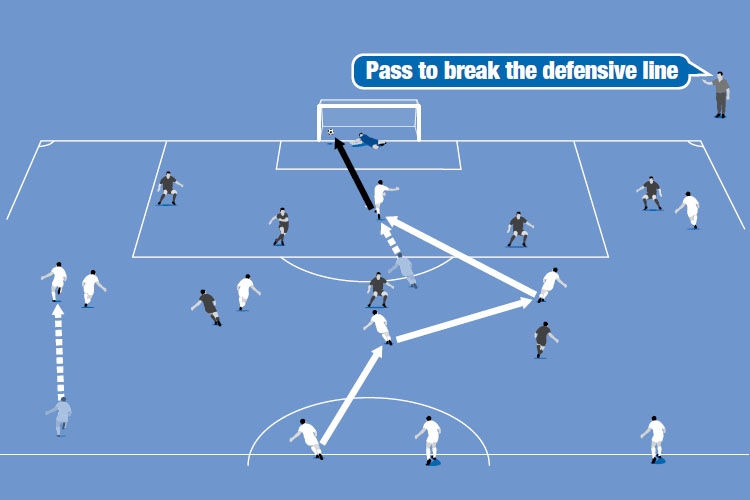 It is important to practise building attacks from different areas of the pitch. When building attacks from defence you can start from a central position (centre backs) or from the sides (right or left full backs).