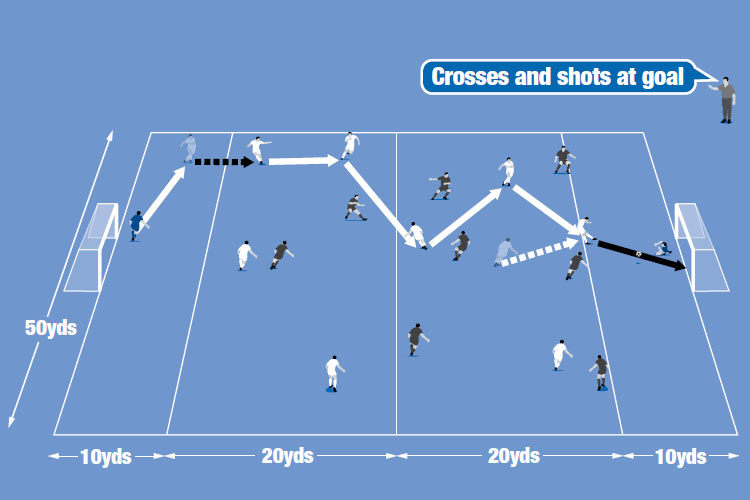 Mark out a 60 x 50 yard area using cones. Now split the pitch into four zones: 10 yards at each end and two 20-yard zones in the middle.