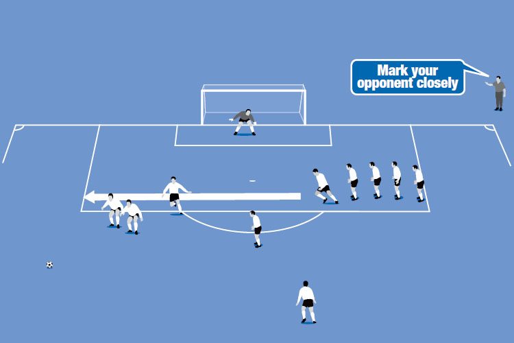 Split the group into two teams to work on defending/attacking a corner. The defending team earns a point for clearing the ball outside of the box. Two points for clearing the ball outside the box into wide areas and three points for clearing the ball to a team mate who can dribble the ball over the halfway line – but the counter break must be made as a team. When defending a corner you should look to have the following in place (11v11 only):
