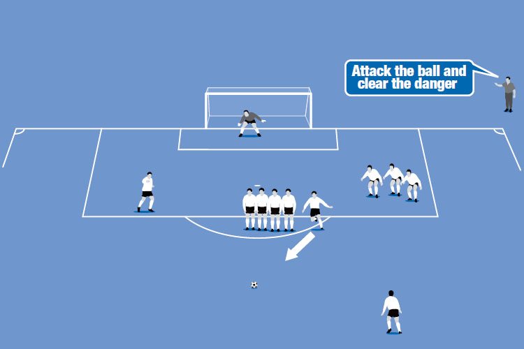 Central free kicks (bottom picture) – use four players in the wall and a charging player to block the shot (particularly for indirect free kicks).