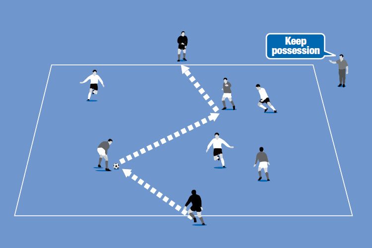 Play a small-sided game with two neutral players. Play normal rules but the team in possession of the ball has a two-player overload situation, using the neutral players, which will help them to keep possession, build attacks and score goals.