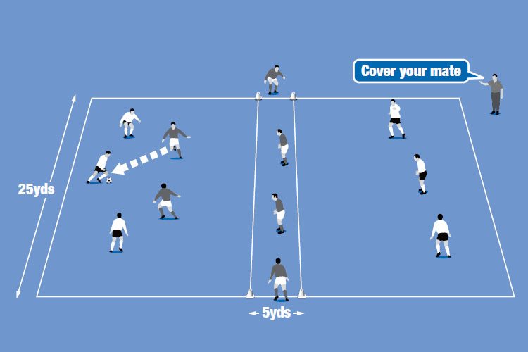 When the nearest defender goes to pressure, the other defenders must take up covering positions to stop other passers from creating a chance to score. The attackers and defenders should be changed after one minute. Set up more areas for other players to work as well or rotate teams regularly in the area.