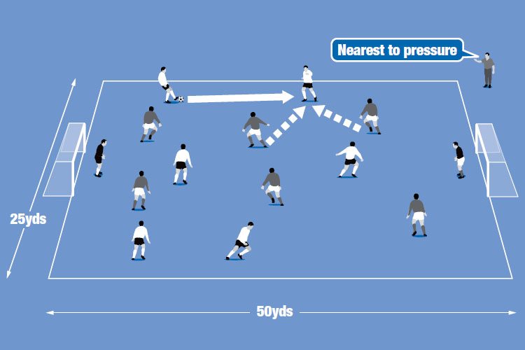 A good defence will be able to pressure its opposition into making a mistake. The rule of this session is that the nearest player to the ball must go to pressure the opponent in possession.