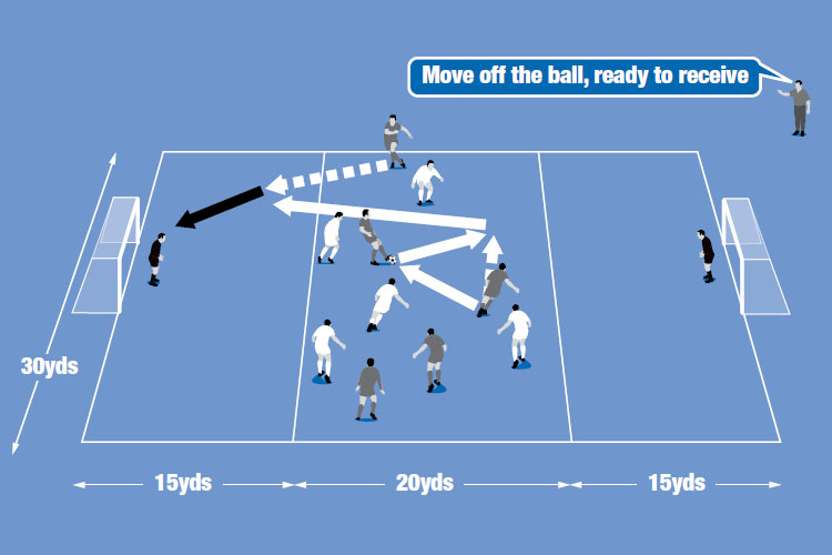 Play a small-sided game between two teams. The pitch is split into three zones and teams start inside the central zone.