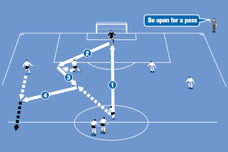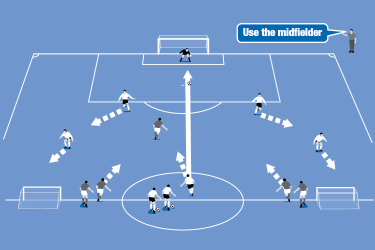 Set up your players in half a pitch, as shown in the top picture. The midfielder (in the centre circle) plays a long ball to the goalkeeper and then runs onto the pitch to help the defence.