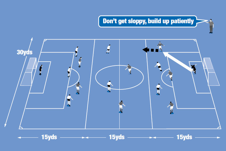 Once the teams are competent in playing out of defence and building attacks, you can then take away the zones. The team that scores goals wins.