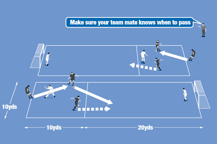 The aim is to make a pass past the defender and into the next zone for one of the attackers to race on to and score a goal past the keeper.