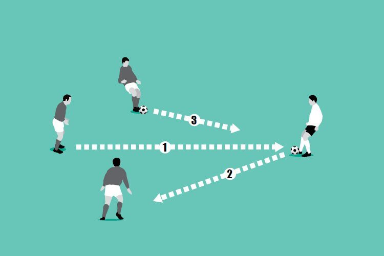 The first server with a ball passes to the receiver, who must control with their first touch and pass with their second to the server who started without the ball. The receiver then gets a pass from the second server with a ball and repeats.