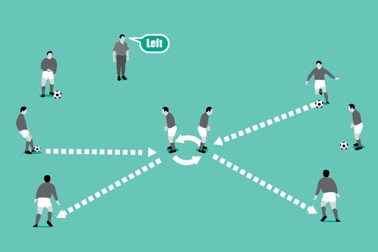 Arrange two sets of servers and receivers so the receivers are standing back-to-back, 2 yards apart. On your command of either “left” or “right”, the receivers must quickly turn in the correct direction and swap positions to face the other trio of servers. They then receive a pass which they must control and return.