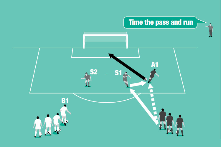 While that’s happening, B1 plays a one-two with S2, and shoots first time at goal. After shooting, B1 becomes the new server and so on.