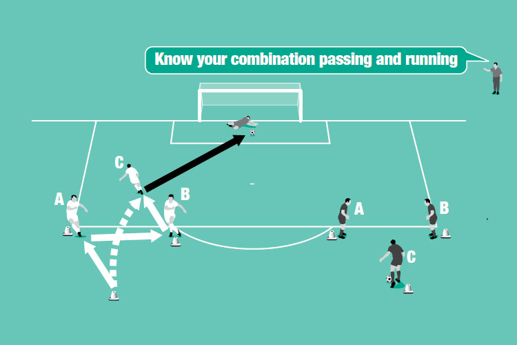C passes to A, A passes to B, B passes forward for C to run on to (as shown in the middle picture).