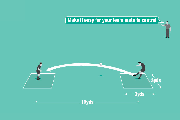 To progress, increase the distance between the squares to 20 yards so each player has to control a more difficult ball and execute a more accurate pass.