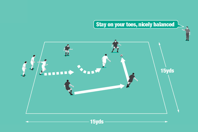 Mark out a 15-yard square area and use eight players. Play begins with four attackers trying to keep possession against a single defender. An extra defender is added at 30-second intervals until team numbers are equal.