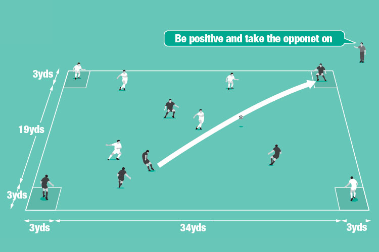 Mark out an area with a three-yard square in each corner. Play 6v6 and place a player from each team in diagonally opposite corners, as shown in the bottom picture.