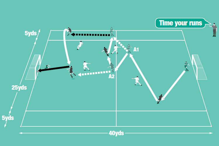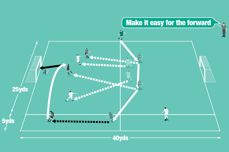 Play 4v4 on a 40 x 25-yard pitch with two manned keepers. Have an additional five-yard crossing on both sides.