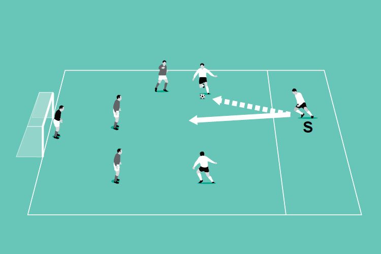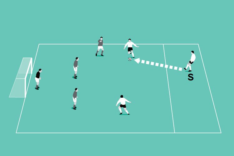 The server (S), who has the freedom to move in their zone but cannot leave it, starts an attack by passing to one of the two attackers in the large area.