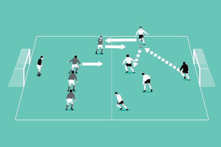 Play 4v4 with two keepers in an area 30 yards by 20 yards.