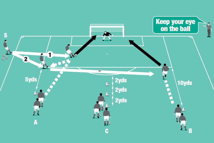 Use the final third of a pitch. Create three teams (A, B and C) of three players facing the goal – one at each side of the box and the other in the middle. Add cones in front of team C.
