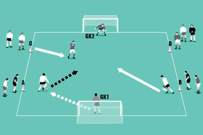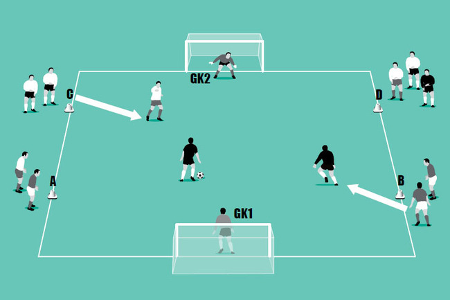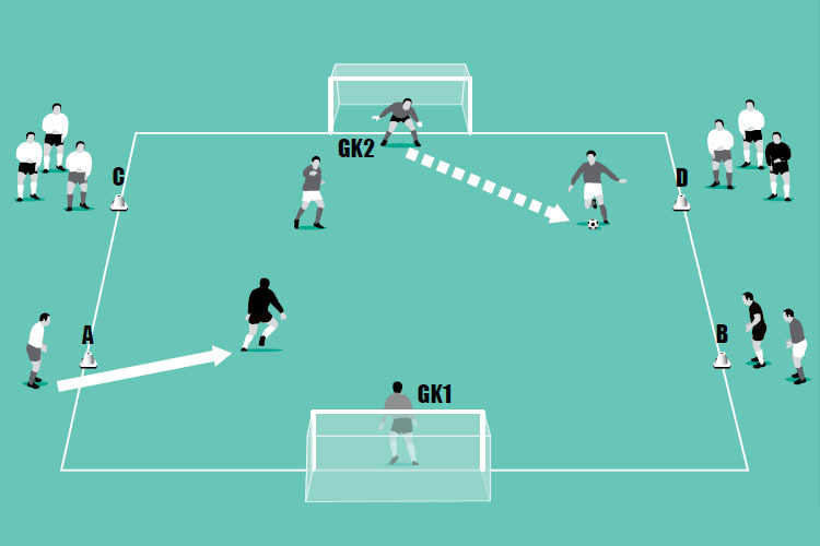 The drill starts with a keeper rolling a ball to one of the two nearest cones (A or B) to a player who has a team-mate at that end of the pitch. The pair attack the opposite goal.