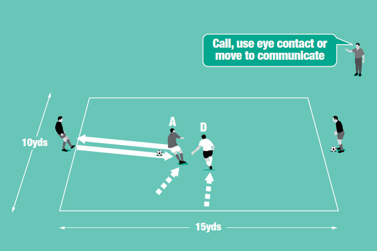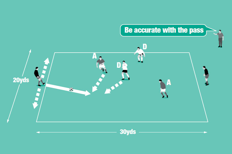 The defender can add pressure and intercept but cannot challenge for the ball. Encourage attackers to try and lose the defenders with runs.