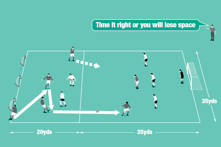 In a larger area, use a full-size goal at one end and three target or mini goals at the other. Mark a 20-yard zone at the end with the target goals. Use 12 players. Play a 3v2 in this area and a 2v3, plus a keeper, in the larger area. The final attacker acts as a server at the end with the smaller goals, as shown in the bottom picture.