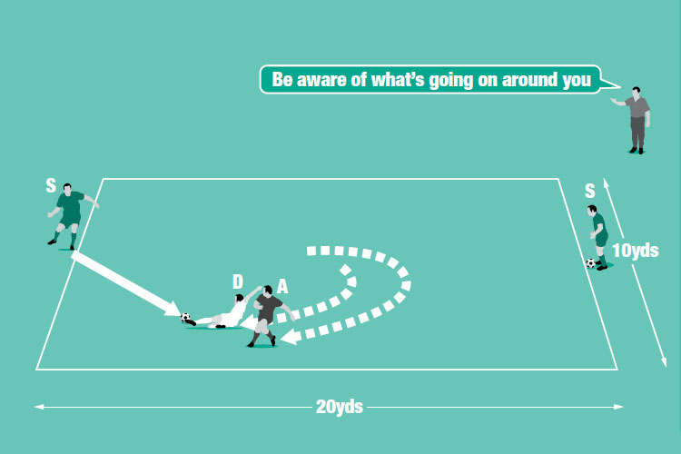 Mark out a 20x10 yards area and use four players. Two are servers (S), one an attacker (A) and the other is a defender (D). Put one server at each end of the area and play 1v1 in the middle.