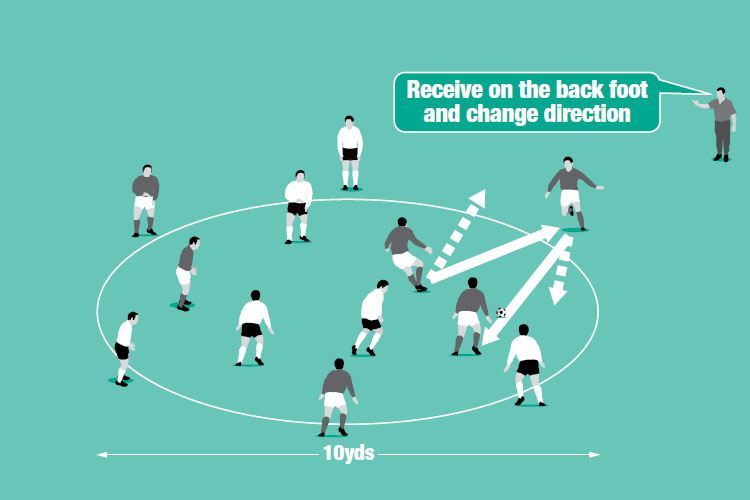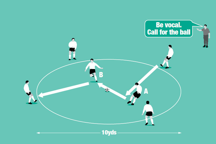 Five players are equally spaced around a circle with one player working in the middle. The player in the middle calls for the ball from one of the outer players, controls it then passes to the next player in the circle, then calls for the ball again, moving clockwise around until the circle is complete.