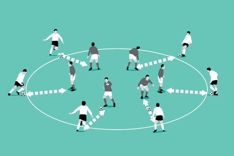 Split the squad into three teams of four players, consisting of servers outside the circle, and receivers against defenders inside. Receivers try to lose their marker before controlling a pass from a server, then returning it.