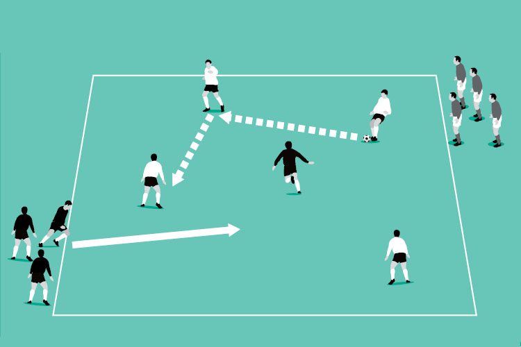 To progress, receivers take a pass from one server but pass back to a different server. This helps players develop an awareness of what’s happening around them. Teams switch roles.