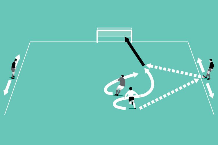 Play 1v1 with an additional support attacker positioned on each touch line, which they can move along. The attacker in the playing area has to lose his marker. He can only score after passing to one of the touch line attackers and receiving a return pass. Defenders win points for tackling and knocking the ball out of play. Play for a set period of time, say two minutes, after which the players switch roles so they all have a turn at being the attacker.