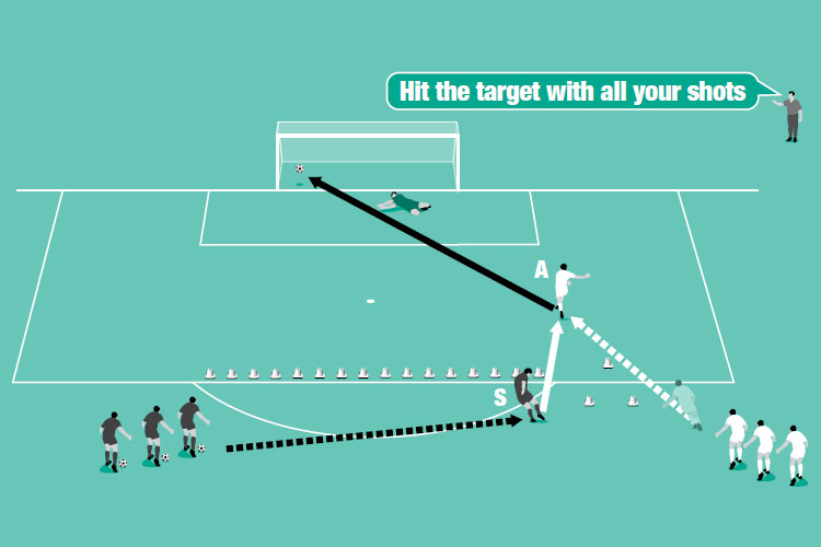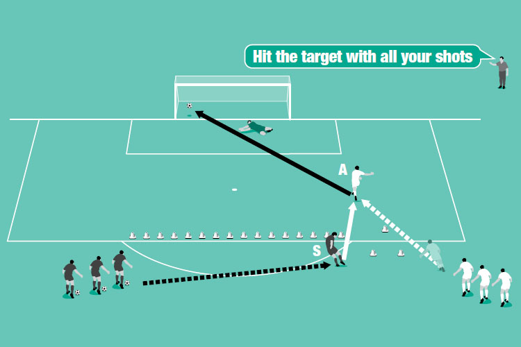 At the beginning of each channel at the opposite end to the goal place a number of balls and a line of players. The players dribble a ball down the channel and shoot across the goal, aiming for the gap. They then run behind the goal and join the line going the other way and shoot with the other foot.