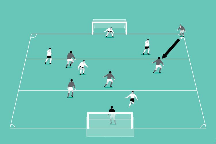 Play a small-sided game in half of the pitch with a goal at each end. Split the pitch into thirds. Instead of teams taking throw-ins in their attacking third, they are awarded a corner instead.