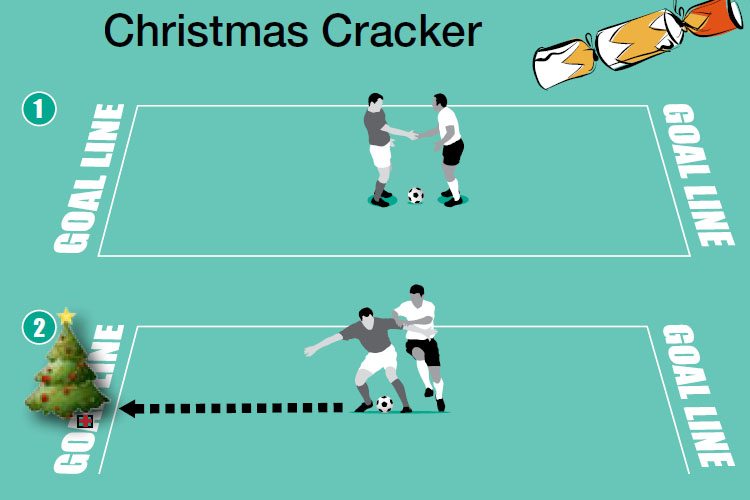 Christmas Cracker: Use one ball between two players in a playing area about 15 yards by 10 yards. Players face each other with a ball at their feet. Players should grip their opponent’s hand as if shaking hands.