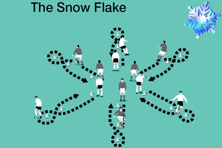 The Snow Flake: Place six cones in a hexagon shape. Moving away from the hexagon, place a “gate” (a pair of cones) 10 yards from each of the hexagon cones.