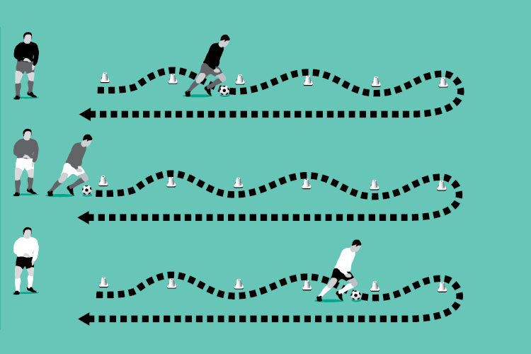 Players take it in turns to “slalom” the ball through the cones without touching them. Once they reach the end, they sprint back and give the ball to the next team mate. The first team with all four players back is the winner.