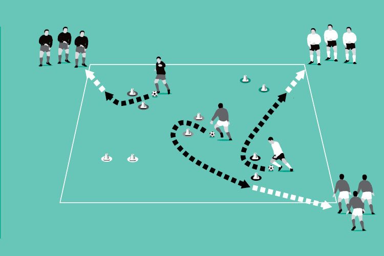 Each team starts from a different corner. The first player from each team must dribble through each pair of gates, in no set order and in any direction, before passing to the next team mate in line.