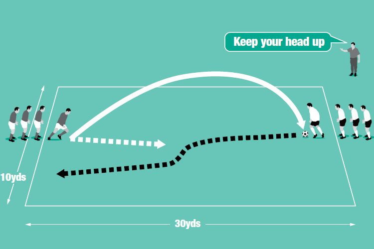 The first player in one of the lines – a defender – chips a ball to the first player in the opposite line – an attacker – before moving forward quickly to close the space between himself and the attacker.