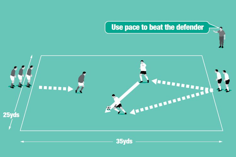 To progress, make each defender active. This means they not only run towards the attacker, they can also challenge for the ball. This 1v1 is finished after either: