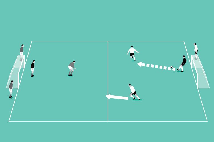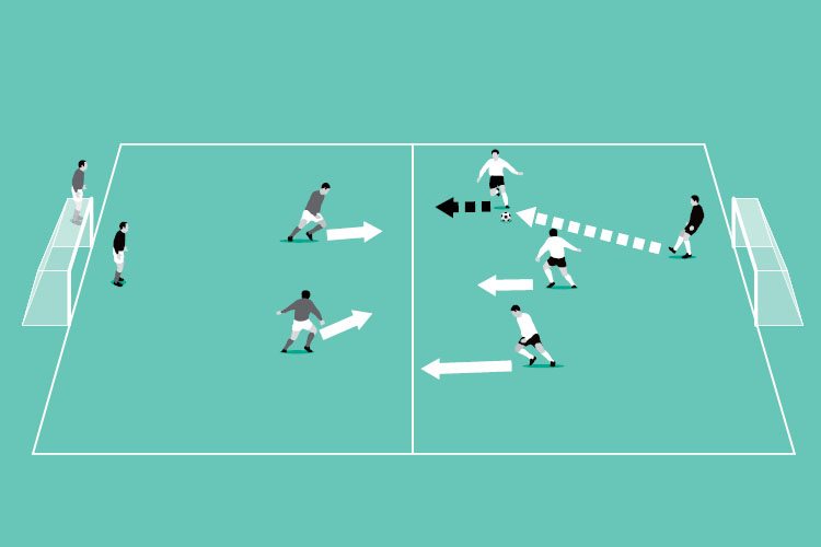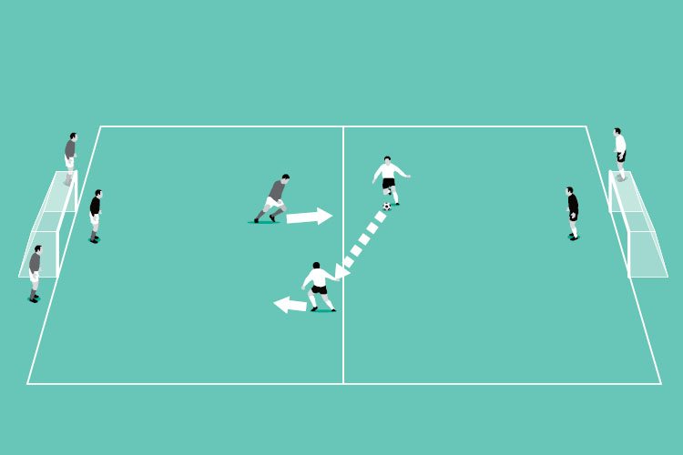 Now play a normal game of 4v4 where both teams try to score. Temporarily remove a player from one team and encourage the other team to exploit the overload situation.