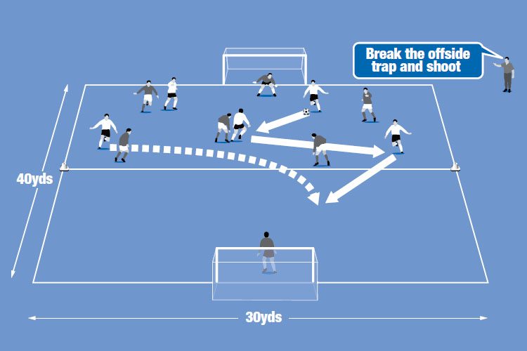 Use offside in this practice to improve the players’ timing of the run and when to pass the ball.